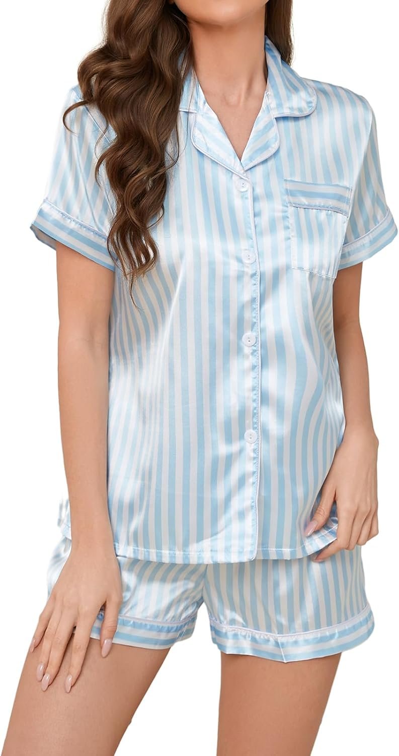 • 【Trendy Elegance, Anytime, Anywhere】- Elevate your style with the trendy design featuring classic stripes, Classic Notch Collar, short sleeves, and a button-up finish. This satin pajama set isn’t just for bedtime – it’s your go-to choice for sleep, pajama parties, lounging, and even as exquisite lingerie. Make every moment an opportunity to showcase your natural elegance.