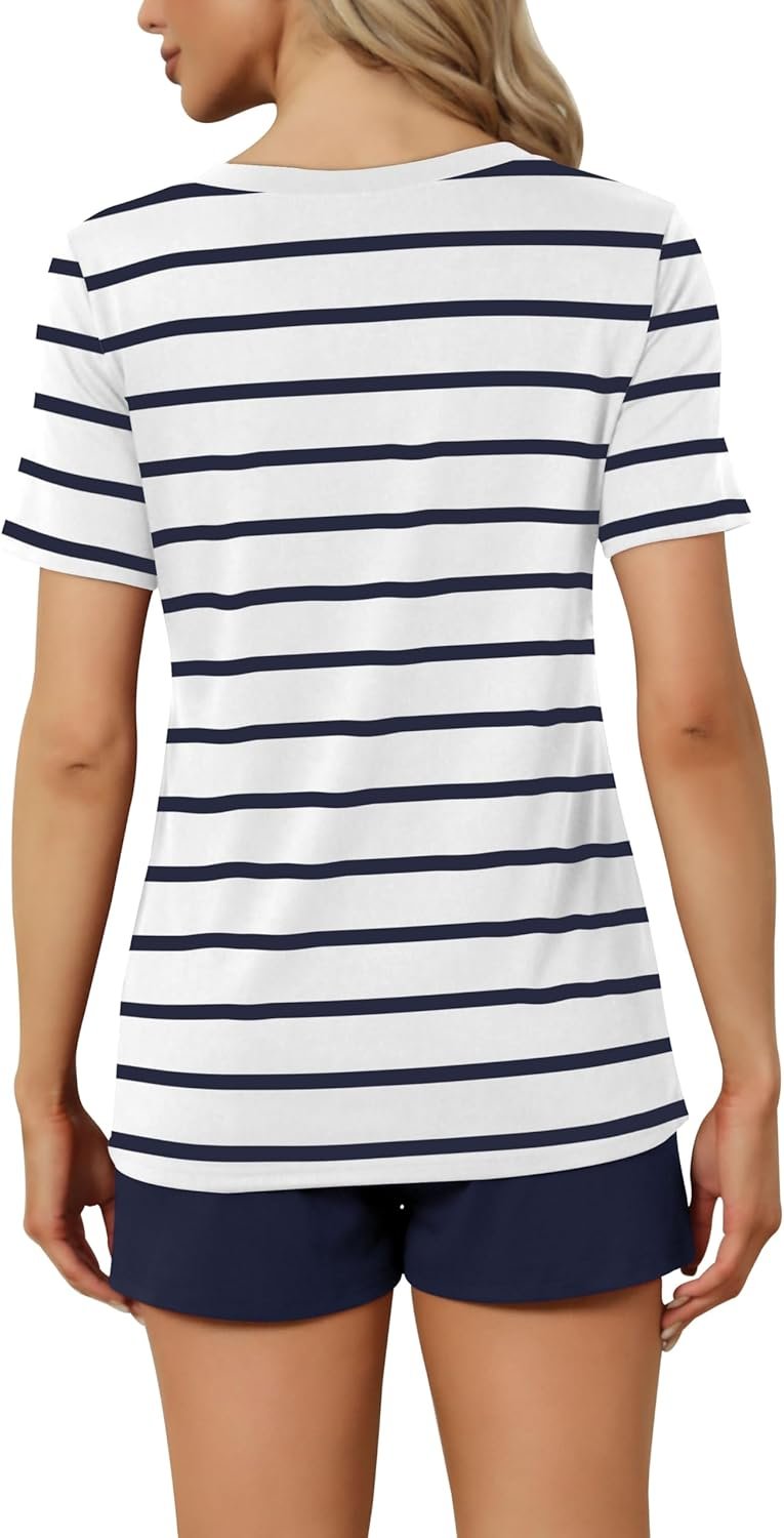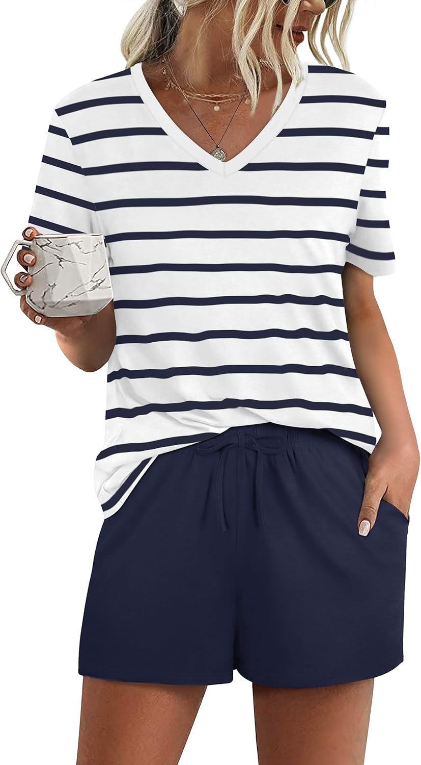 - FEATURE — The package including 1 x short sleeve t-shirt and 1 x short. The top has classic v neckline. The short has elastic drawstring and side pockets. The cute top is perfectly complemented by shorts. Casual and sexy in daily life.